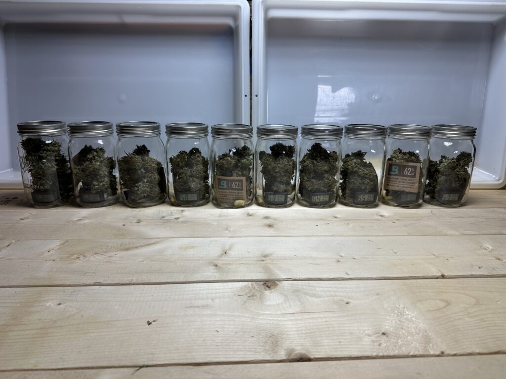 The line up….now the buds cure Ideally with humidity between 60-65%, and temperatures not over 70° the buds will continue to cure for months, and only get better. (To a point)